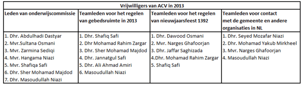 ACV heeft er in 2013 weer voor gezorgd dat de Afghaanse gemeenschap bijeen is gekomen om het nieuwjaarsfeest (van 1392) te vieren. Tijdens deze viering is het verslag van 2012 gepresenteerd en besproken met de Afghaanse gemeenschap.